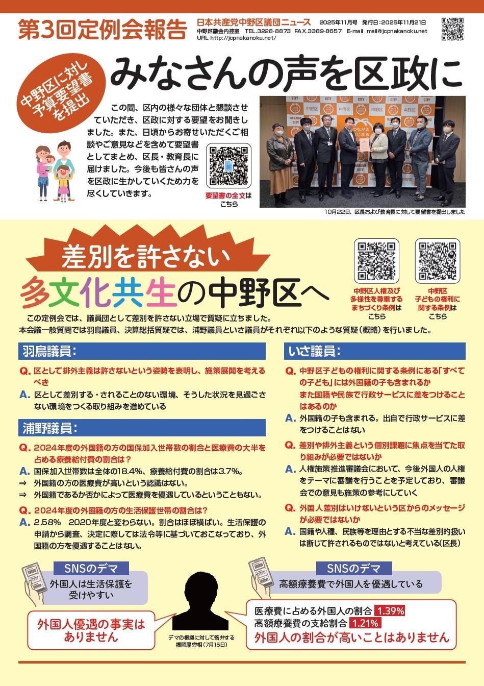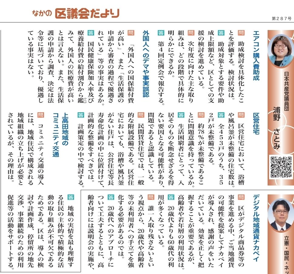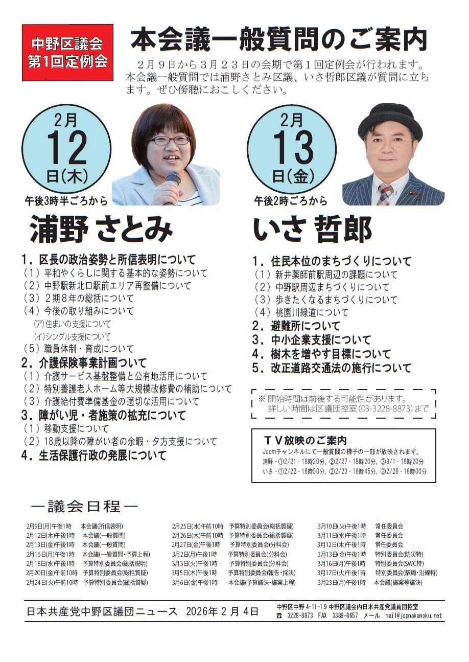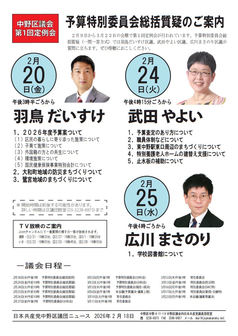 録画配信はこちらから、議事録は区議会ホームページにアップされ次第、リンク先を掲載いたします。