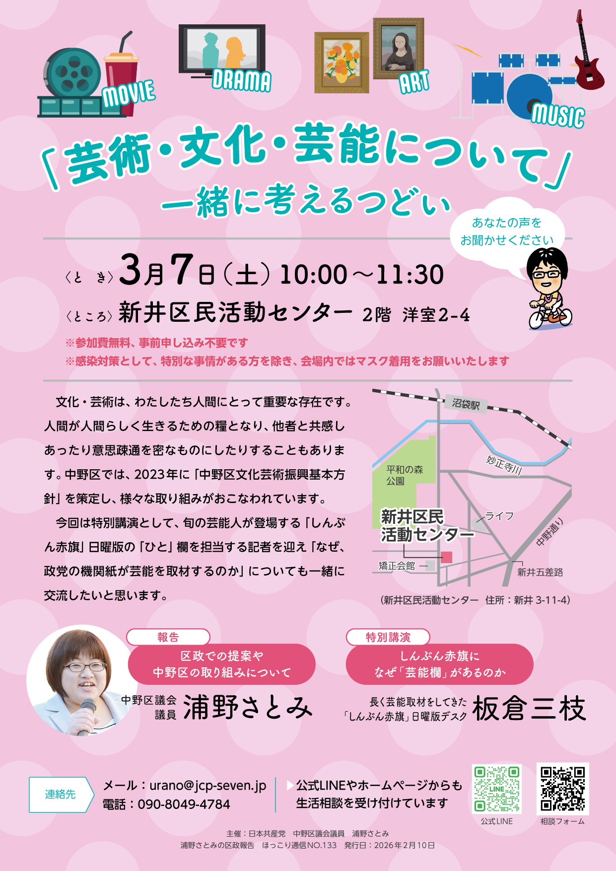 区政・都政・国政と結んで、皆さんの声を真っ直ぐ届けながら、その声がしっかり届く政治へ、全力を尽くします。そして、困難はあっても、あなたのその声が、必ず政治を動かします。政治の主役は皆さん一人ひとりです。これからも、あなたの声をきかせて下さい。そして、一緒に力をあわせていきます。