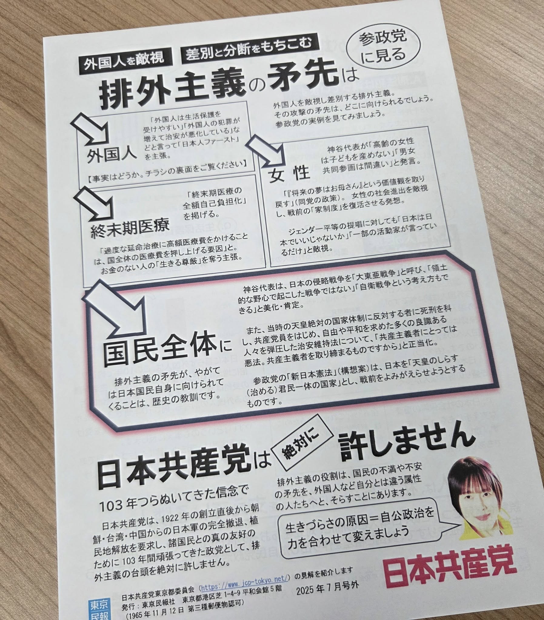 「中野区に住んでいる外国人です。生活や社会の環境について不安なことがあります。考えや意見を伺いたくお時間をいただけますでしょうか」と連絡が。昨日、お会いしてお話を聞かせていただきました。排外主義が強まる状況、メディアも加担している現状への強い危機感を共有してくださいました。私からは、特に参院選後に同じような危機感を持つ方からの連絡が増えていること、党として差別・排外主義に正面からたたかうこと、区議会での質疑や中野区の多文化共生にかかわる姿勢などをお伝えしました。「こうして話せる人がなかなかいなくて不安でしたが話しができて本当に良かったです」と。