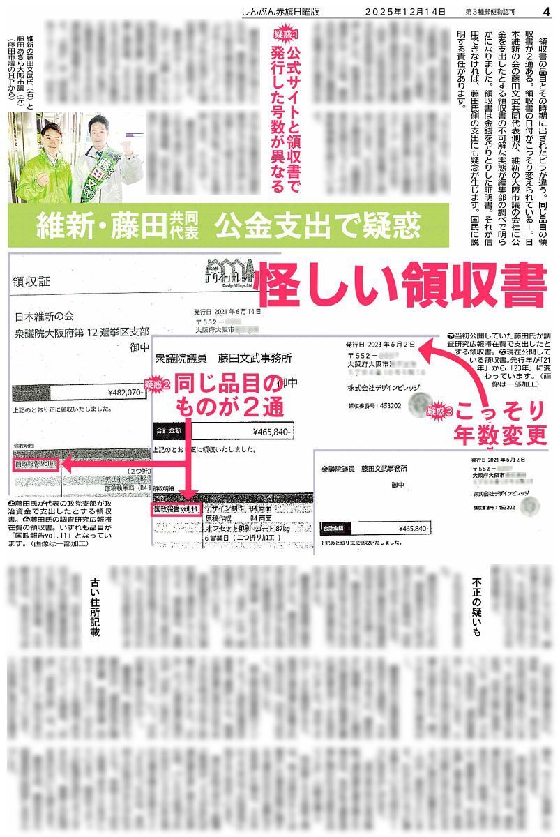 しんぶん赤旗日曜版のスクープ続報です。日本維新の会・藤田文武共同代表の公金支出の問題で新たな疑惑が..。領収書の品目とその時期に出されたビラが異なっていたり同じ品目の領収書が2通あったり..。また、領収書の日付がこっそり変えられているなど、不可解な実態がしんぶん赤旗編集部の調べで明らかになりました。明日12月14日付の最新号(電子版の一部)は