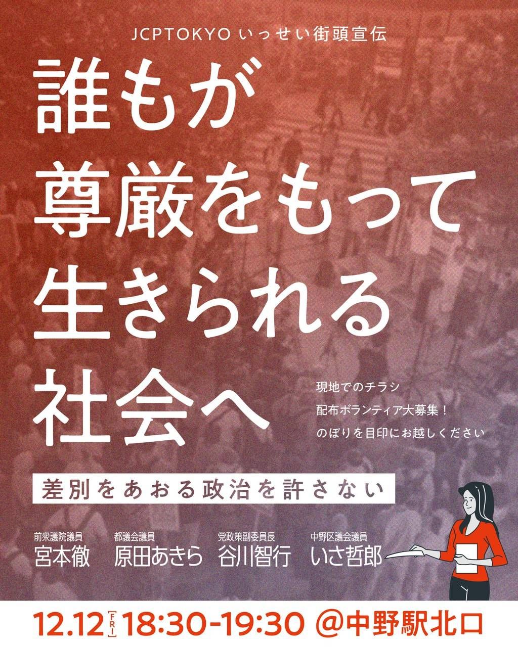 本日12(金)18:30-19:30、中野駅北口にて宮本徹さん・原田あきらさん・谷川智行さん・いさ哲郎さんがスピーチします。こちらから、LIVE配信でご覧いただくことができます(アーカイブあり)。