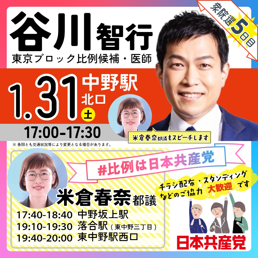 本日1月31日(土)、谷川智行・比例候補が中野へ。17:00-17:30、中野駅北口で米倉春奈・都議とともにスピーチします。その後、中野坂上駅/落合駅/東中野駅西口で、米倉春奈・都議と地元区議もスピーチします。チラシ配布やスタンディング、情報拡散など、心から歓迎します。