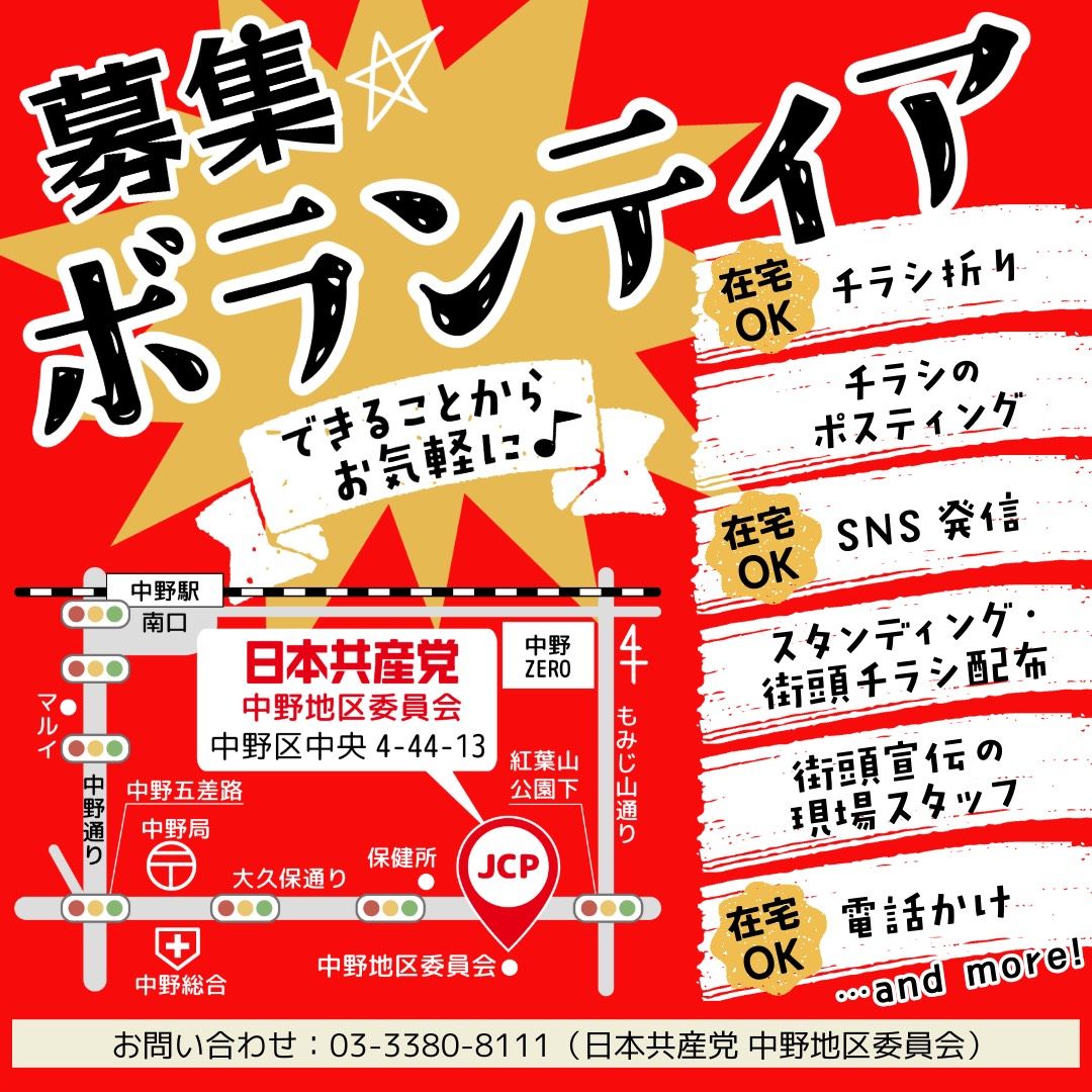 日本共産党中野地区委員会(党事務所)では、ボランティアを募集しています。「SNS発信やリポスト」「チラシ折り(短時間でも)」「ポスティング(何枚からでも)」「街頭宣伝に参加」「公式LINEニュース登録」など、中野区外・東京都外の方も大歓迎です。政治の主役は一人ひとりです。希望持てる社会へ一緒に力をあわせていけたらと思います。