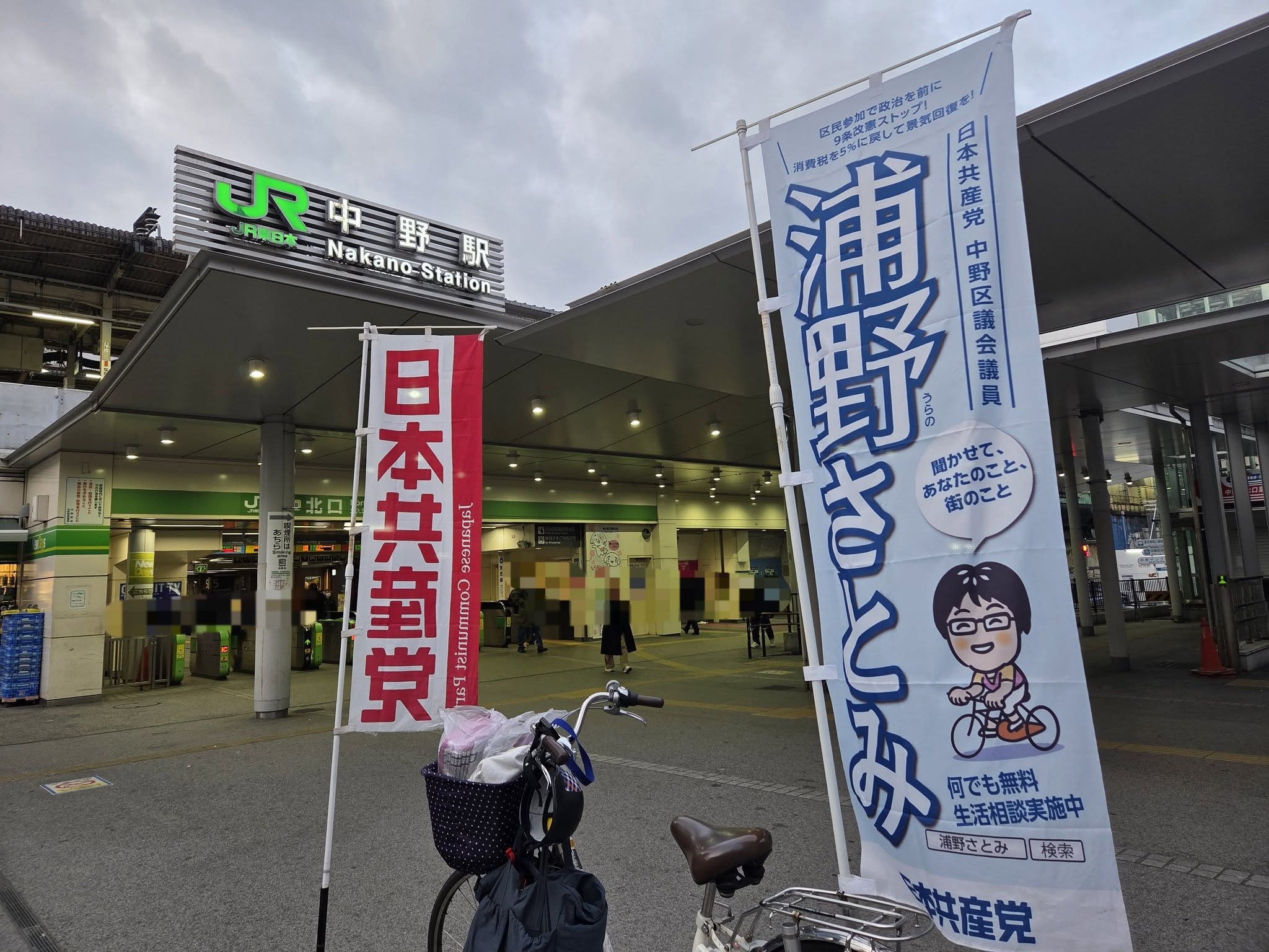 おはようございます。中野駅北口で朝のご挨拶。自転車で駅に向かう途中、黒塗りの大きな車がスピードを緩めて私の横に。ドキッとして目を向けると窓が開き、さらにドキッとしていたら、車内から「頑張って。応援してるから」と力強い激励が。駅頭も含め、今日もお一人おひとりから力いただく朝でした。