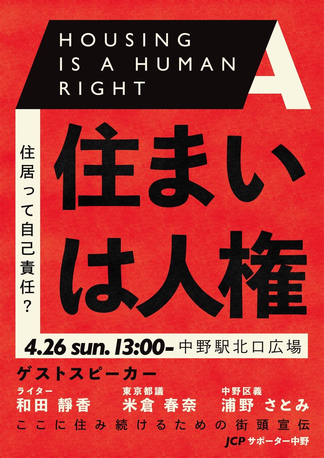 先週、雨で延期となった、JCPサポーター中野の皆さん主催の「住まいは人権」街宣。日程が決まりました。4月26日(日)13時~、中野駅北口です。ライターの和田靜香さん、米倉春奈・都議と一緒にお話します。当日、ストリート対話を通じてお寄せいただいた質問にもおこたえする双方向の街宣です。一緒に考えることができたら嬉しいです。